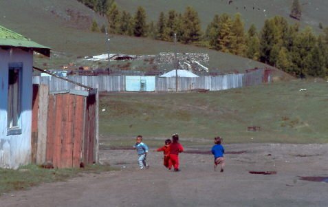 Als ich am nächsten Morgen aufwache, ist es draußen deutlich kälter geworden. Die Sonne strahlt vom blauen Himmel auf endlose grüne Steppen. Wir haben die Ausläufer der Wüste Gobi erreicht. Riesige Antilopenherden bevölkern die Steppe. Reiter auf kleinen zottigen Pferden bewachen ihre Yaks. Kamele und Jurten. Manchmal sehen wir stundenlang keine Menschen, nur die Herden oder auch mal ein ausgebleichtes Pferdeskelett. Wenn dann eine Siedlung auftaucht, besteht sie nur aus ein paar Hütten und Jurten.