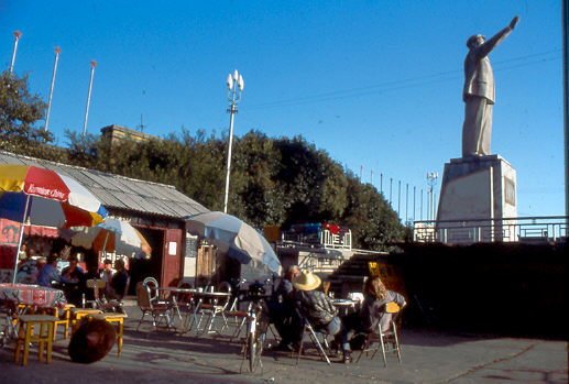 Direkt gegenüber vom Busbahnhof gibt es eine mehrere Meter hohe Mao-Statue. Mao steht aufrecht im Anzug dort und weist mit der ausgestreckten Hand nach Westen. Dieser steinerne Arm bietet den Tauben einen willkommenen Rastplatz.