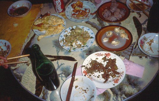 Das Essen ist ein wenig anders als in China. Es werden sehr viel Kartoffeln verwandt, was sicher nicht original ist. Als Gewürze gibt es viel, sehr viel Knoblauch und Anis. Mit Pilzen, Lotoswurzeln, Kastanien und anderen Gemüsen werden schmackhafte Speisen zubereitet. Dazu wird das leckere Naxi-Brot serviert. Dieses Fladenbrot wird aus einer Mischung von Teig und kleingehackten Frühlingszwiebeln hergestellt. Einfach köstlich!!