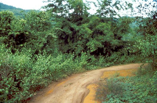 Nach ungefähr 1 Stunde müssen wir die asphaltierte Straße verlassen und auf einem Feldweg weiterfahren. Da es nachts geregnet hat, ist der Weg aufgeweicht und mit tiefen Pfützen versehen. Der zähe rote Lehm klebt an den Speichen fest. Das Fahren wird immer mühsamer. Außerdem gibt es viele Steigungen, wo wir die Räder schieben müssen. Kathy scheint nicht sehr sportlich zu sein und bietet mir willkommene Möglichkeiten, auszuruhen und zu schieben, ohne meine eigenen untrainierten Muskel zu offenbaren.