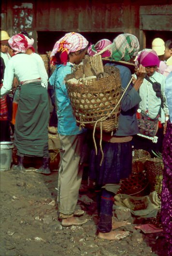 Die Fahrt geht zu einem kleinen Dorf, in dem sonntags die Bauern aus der Umgebung zum Markt zusammen kommen. Wir sehen die unterschiedlichsten Trachten, junge Mönche in ihren gelben Roben, Frauen mit bestickten Tragekörben auf dem Rücken. Das Leben und Treiben auf dem Markt ist bunt und faszinierend. Doch mich erschüttert die Armut, die in dem geringen Angebot und den abgetragenen Kleidern der Menschen deutlich wird.