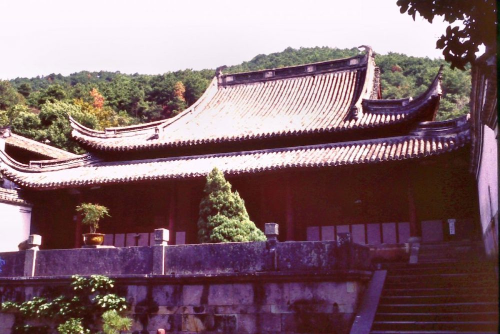 Die Fahrt geht durch kleine Dörfer, dichten Wald und an einer Pagode vorbei. Der Tempel kündigt sich durch mehrere hohe, geschwungene Holztore an. Dann erreichen wir schließlich den Eingang. Der Tiantong-Tempel ist ein bedeutender und sehr alter buddhistischer Tempel der Chan-Richtung. Es gibt einige Mönche, ein schönes vegetarisches Restaurant und viele Hallen mit Buddhastatuen, Räucherstäbchen und Kerzen. Alles ist erfüllt vom Klang der Gongs und Trommeln, die immer dann geschlagen werden, wenn jemand eine Spende entrichtet. Natürlich werfe auch ich einen kleinen Betrag in den Spendenkasten am Altar. Der sanftmütig blickende Mönch nickt zustimmend und schlägt den Gong. Ich stehe andächtig da und wünsche mir für meine Weiterreise Glück und Gesundheit.