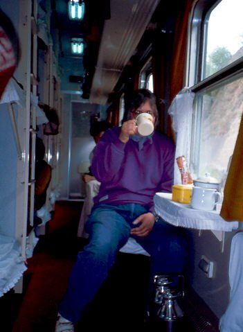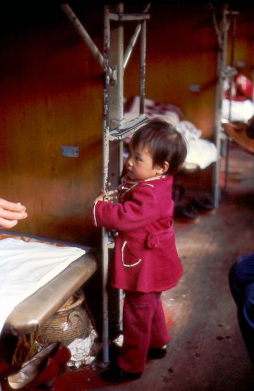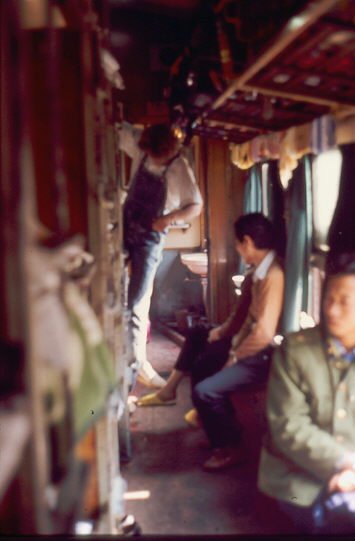 Zur Abendbrotzeit kommt jemand durch den Wagen, der Pappschachteln mit Reis und Gemüse verkauft. Das Gericht ist kalt und merkwürdig gewürzt, so dass mir der Appetit vergeht. Wie alle anderen schmeißen wir unsere Schachteln aus dem Fenster. Mir gefällt das gar nicht, doch was soll ich tun? (Anmerkung 2019: Das ist heute streng verboten und wird vom Zugpersonal unterbunden)