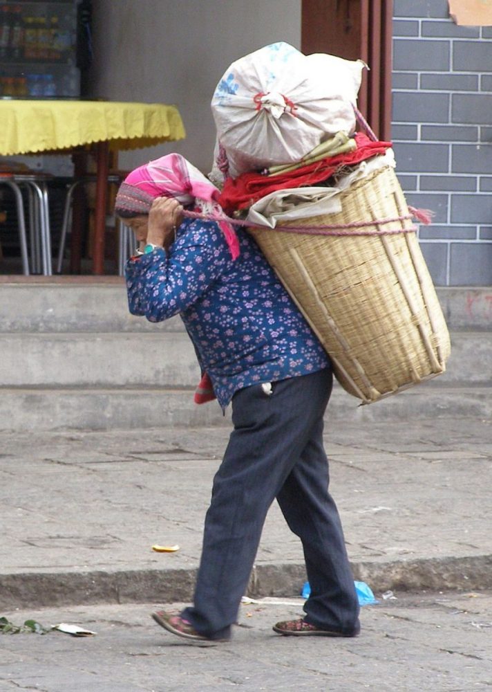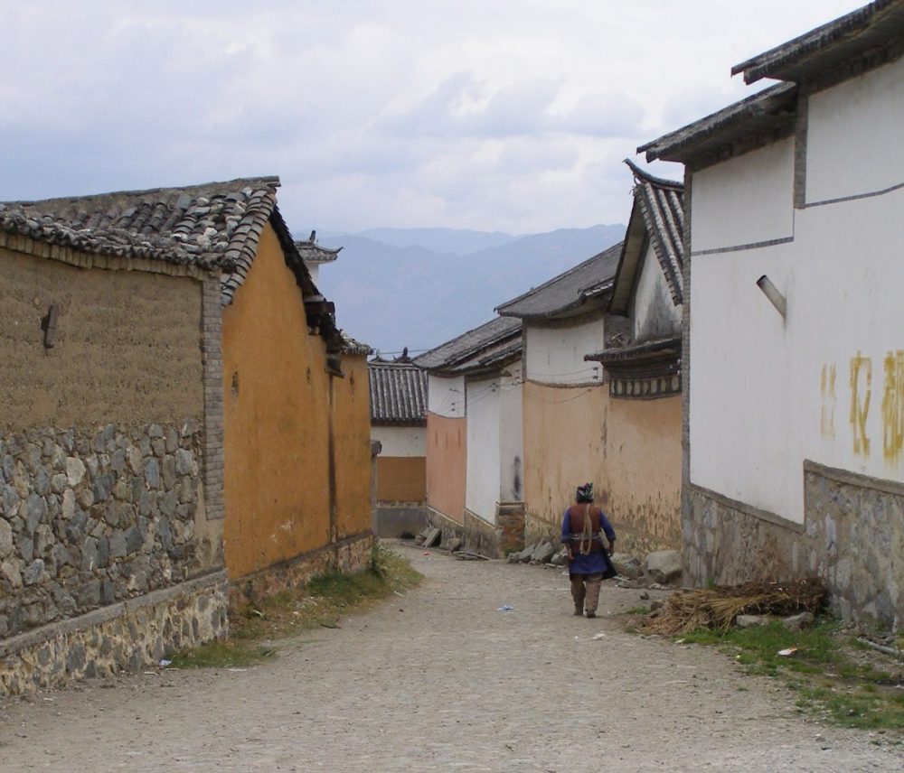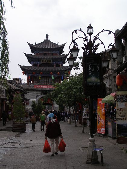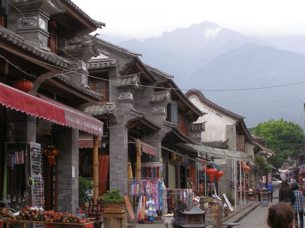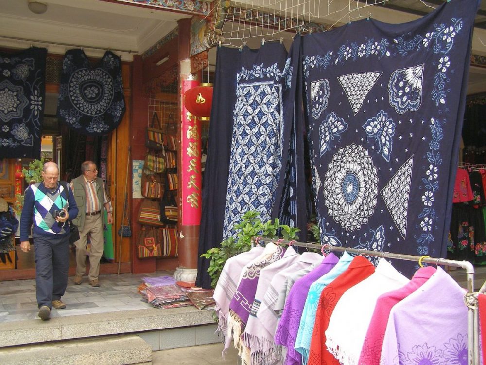 Als der Regen nachlässt, bummele ich durch die engen Straßen des alten Dali. Hier scheint das Leben vor hundert Jahren stehen geblieben zu sein. In den alten Geschäften gibt es keine Glasscheiben in den Schaufenstern. Das Fleisch hängt ungeschützt in der Luft. Große bunte Bonbongläser locken verführerisch. Die Gassen sind teilweise so eng, dass keine Autos durchkommen. Dafür tragen alte Frauen ihre Lasten in hohen Kiepen. Ihr Rücken wird geschützt durch einen Umhang, der mit bunten runden Stoffscheiben verziert ist.