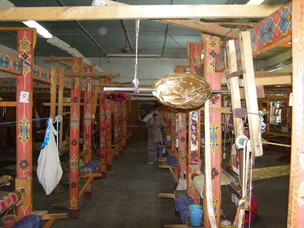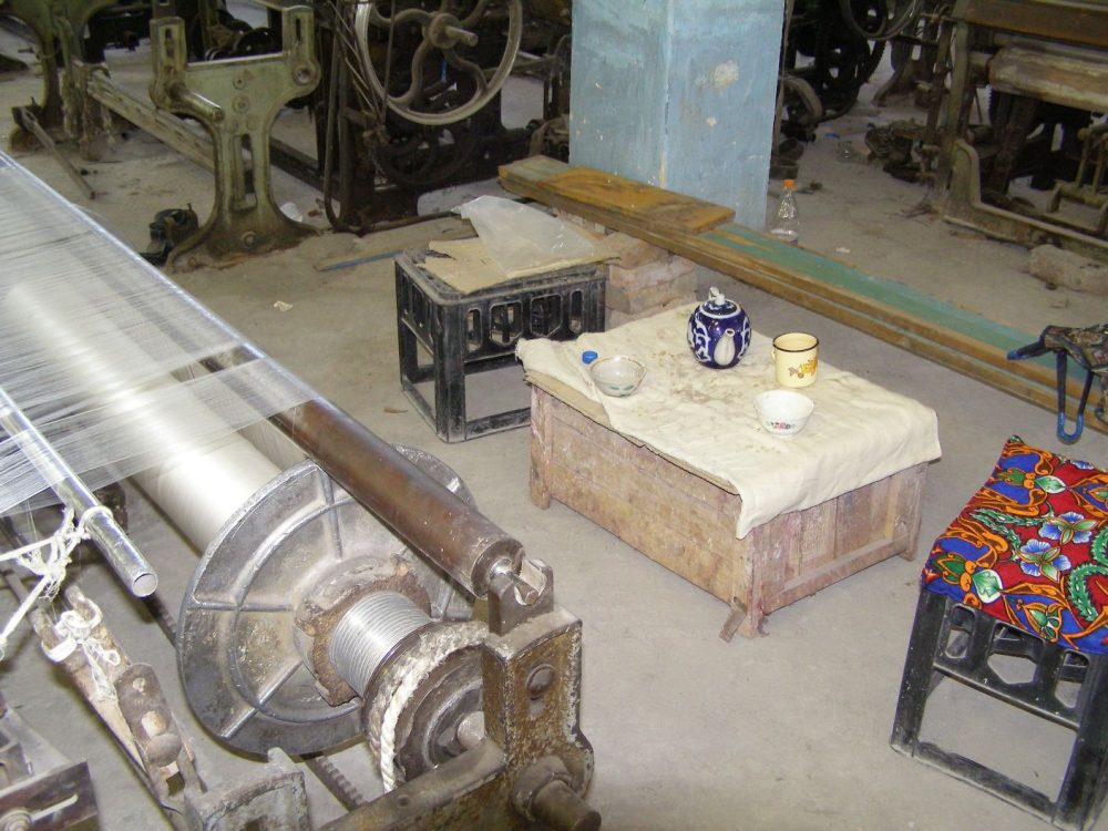 Unser Ziel ist eine alte Seidenfabrik. Natürlich sehen wir nicht die moderne Fabrik mit ihren glänzenden Maschinen sondern den alten Teil. Ein Seidenmuseum! Man hat die alten, etwas düsteren Hallen mit den mechanischen Webstühlen erhalten. Junge Frauen bedienen die Webstühle und zeigen uns, wie die bunten, glänzenden Stoffe entstehen. Auch hier gibt es eine Ecke für eine Teepause.