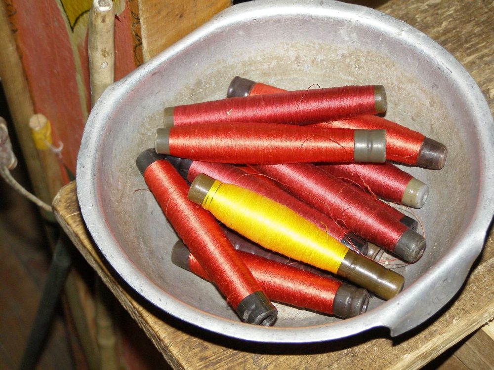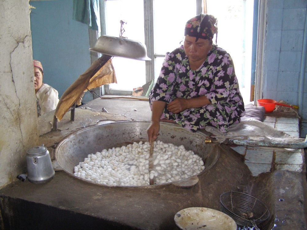 An die Webstühle sind Fotos gepinnt. Vom Mann, vom Kind… Wir lernen den ganzen Vorgang der Seidenherstellung kennen. Von der Zucht der Seidenraupen, zum Abwickeln der Kokons und dem Färben der feinen Fäden. Auch leuchtende Teppiche werden hier hergestellt.