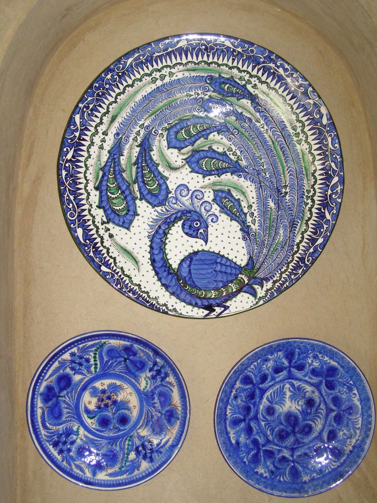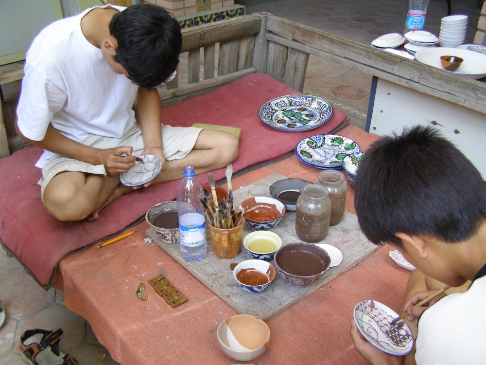 Besonders stolz ist der Chef der Werkstatt, Rustam Usmanov, dass er auf der EXPO 2000 in Hannover ausstellen konnte. Den prachtvollem Teller, der zu der Ausstellung gehörte, würde ich am liebsten gleich mit nehmen. Doch der hat seinen Preis! Kostet mehr als die ganze Reise! Die Keramik wird von Mustern und Motiven in einem strahlenden Blau geprägt, dem Blau der Seidenstraße.