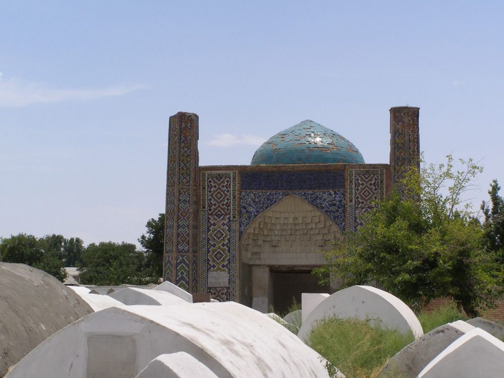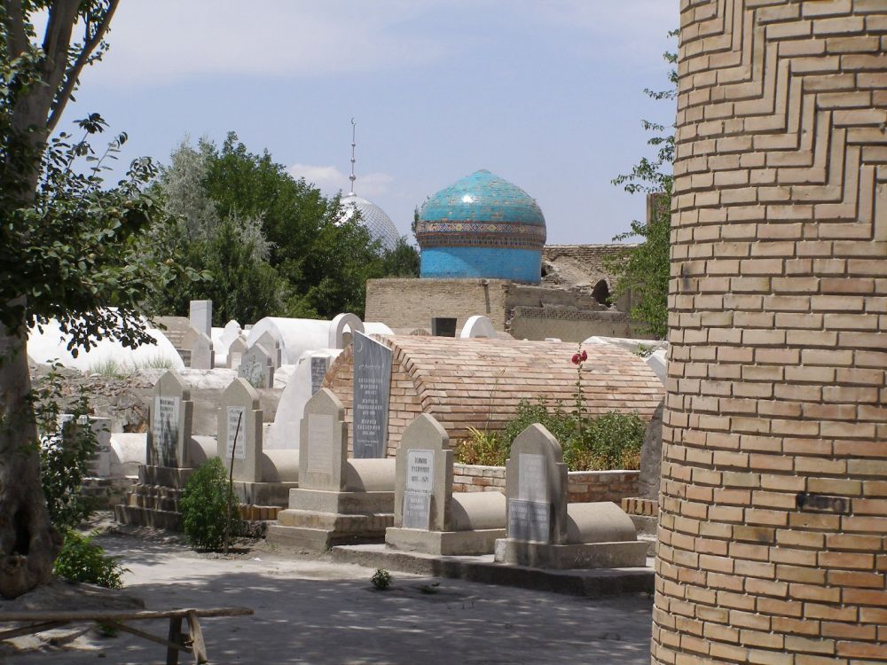 Gleich nebenan gibt es einen alten Friedhof, den Friedhof der Khane. Hier haben wir nun ein paar Minuten Freizeit. Durch ein Portal gelange ich in die von einer Mauer umgrenzte Anlage, die den Khanen von Kokand sowie verschiedenen herausragenden Persönlichkeiten und Stadtbewohnern als letzte Ruhestatte dient. Fröhlich und frei laufe ich los, bewundere die alten Grabsteine und die vielen Blumen.