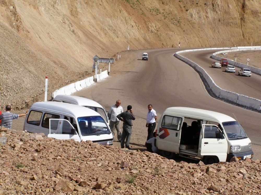 Damals (2007) müssen wir am Fuß der Kamchik-Berge von unserem größeren Bus in kleine Minibusse, die schon auf uns warten, umsteigen. Koffer schleppen, die Minibusse sind klein und nicht sehr bequem. Die üblichen Meckerer erheben ihre Stimmen. Darauf hätte man sie nicht vorbereitet. Egal, ob vorbereitet oder nicht, wir müssen da jetzt durch!