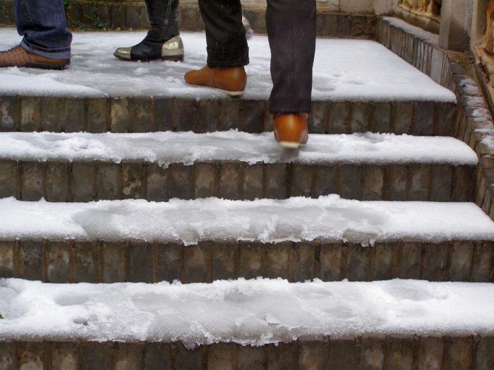 Der Aufstieg ist gar nicht so einfach, da die Stufen dick mit Schnee bedeckt sind, der an manchen Stellen zu Eis fest getreten wurde. Mühsam erklimme ich den Gipfel und stelle gleich fest, dass das eigentlich ein Fehler war, denn ich muss ja auch wieder hinunter! Es gibt kein Geländer, nichts, an dem ich mich abstützen könnte.