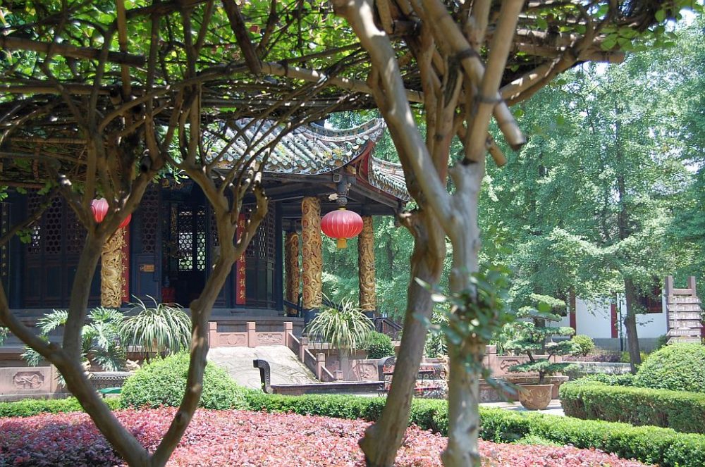 Die Hallen des Tempel der Grünen Ziege sind umgeben von Parks und kleinen Pavillons. Es ist ein wunderbarer Platz, um die Chengduer bei ihren Freizeitbeschäftigungen wie Schachspielen, Taiji und mehr zu beobachten.