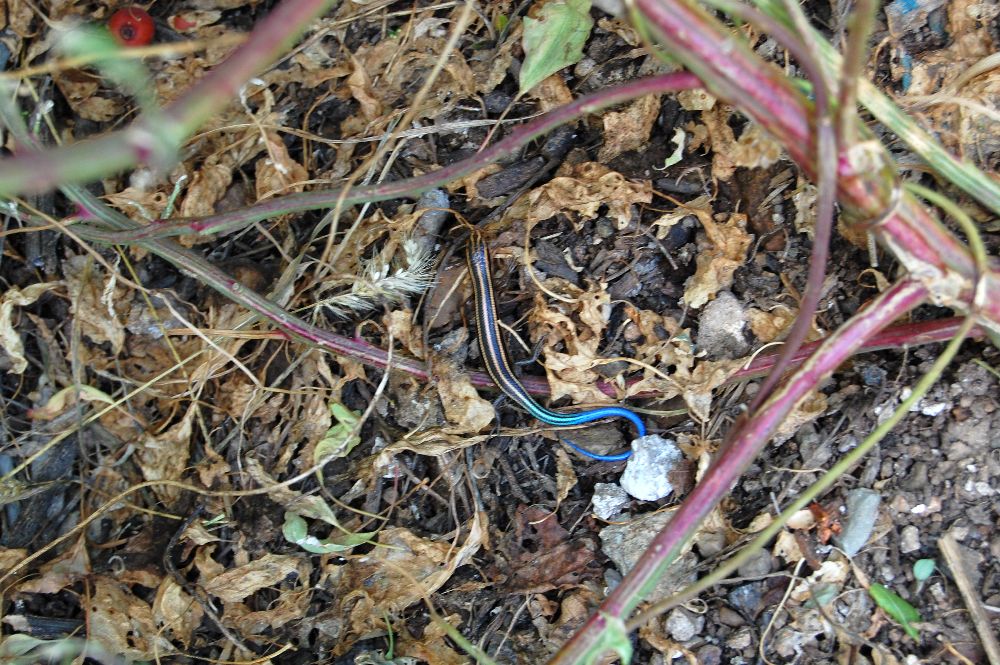 Mein Knöchel schmerzte immer mehr. Irgendwann drehte ich um. So konnte ich nicht weiter! Langsam tastete ich mich den Weg hinunter. In einem kleinen Imbiss weiter unten trank ich ein Wasser und schaute auf den See und die Große Mauer. Irgendwo auf der anderen Seite musste der offizielle Zugang zur Chinesischen Mauer liegen. Hier genoss ich die Ruhe und Idylle. Die Ruhe war gar nicht so groß, denn über allem lag der laute Gesang der Zikaden. Dann hatte ich noch eine ganz besondere Begegnung: Die elegante Eidechse