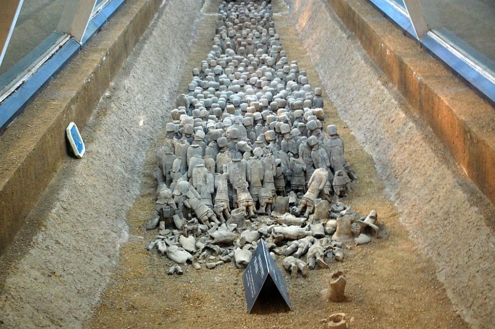 Dazu muss man auch wissen, dass sich die Terrakotta-Armeen in ihrer militärischen Aufstellung niemals im eigentlichen Grabmal befanden. Sie wurden in der Regel rund um den Hügel in eigenen Gruben aufgestellt. So war das auch bei dem Grab Han Yang Ling bei Xi’an, obwohl man die Figuren heute im Grab selbst ausstellt.