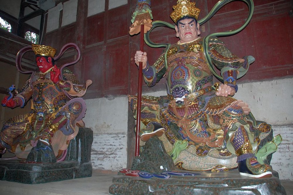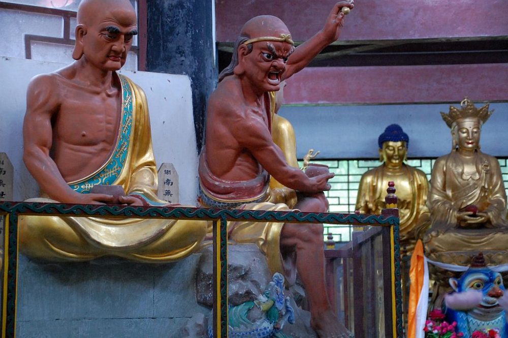 Erbaut wurde der Fuhu Si während der Tang-Dynastie (618 – 907), zu einer Zeit, als sich in den dichten Wäldern des Emeishan noch Tiger rumtrieben. Man versprach sich Schutz vor den Raubtieren. Aber ich denke, es geht auch darum, den Tiger, das Wilde in sich zu bezwingen. Ursprünglich war der Tempel daoistisch. Wenn man genauer hinguckt, kann man so manche alten daoistischen Heiligen entdecken.