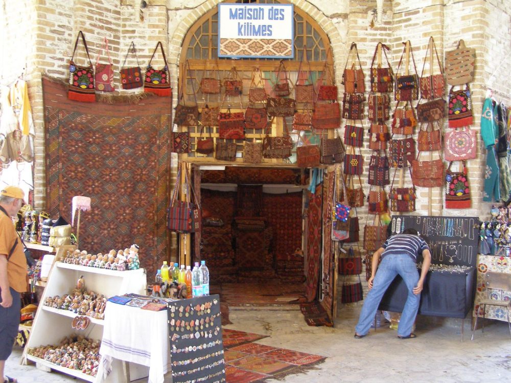 In der wärmer werdenden Sonne marschieren wir in die Altstadt. Als Zugang dient ein erster Basar, der Tak-e Sargaran. Ein altes Gebäude, einst der Basar der Juweliere, schön renoviert, mit vielen Souvenirläden. Manche mögen das nicht so schön finden. Ich finde es nicht schlimm. Immer schon wurden hier Waren angeboten, die Waren der Seidenstraße, Seide, Keramik, Messer, was man eben so braucht.