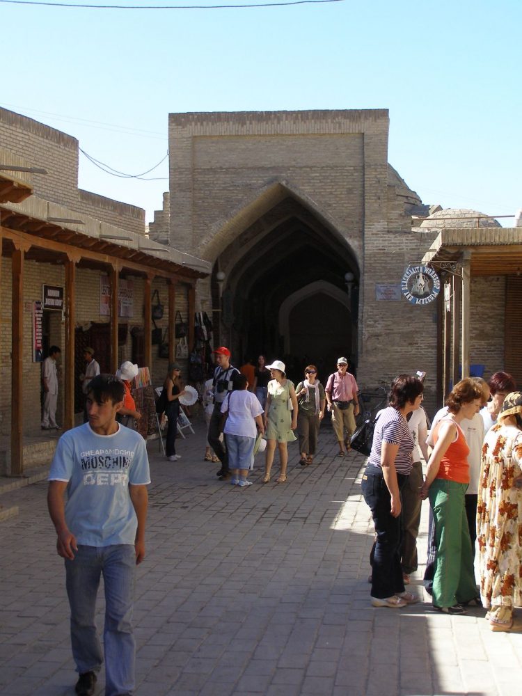 Buchara scheint nur aus Moscheen und Medressen zu bestehen. In manche treten wir ein, bewundern die feinen mit steinernen Ornamenten vergitterten Fenster. Die Höfe sind weit, die Hallen, Räume liegen in einem sanften Schatten. Wir sind nicht die einzige Gruppe Touristen, die von Moschee zu Medresse und weiter streifen, den Ausführungen ihrer Reiseleiter lauschen. Aber ein richtiges Gedränge gibt es nicht. Ich selbst streife gerne mal ein paar Meter abseits meiner und anderer Gruppen durch die Räume, schaue nach Souvenirs und handle lächelnd mit den Verkäuferinnen.
