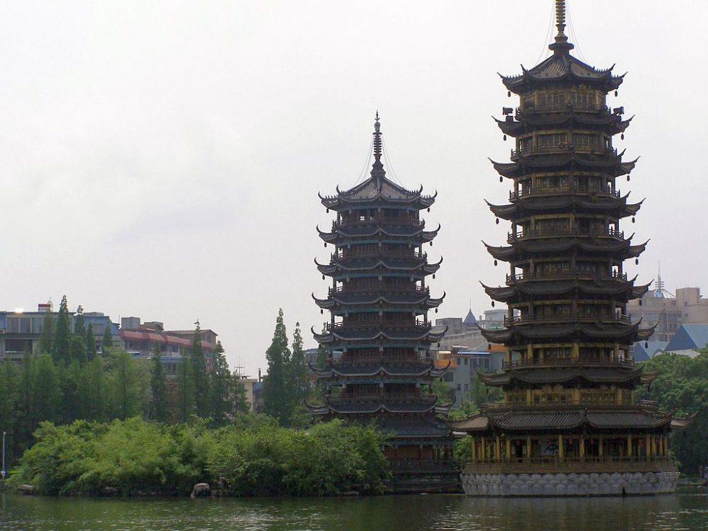 Da stehen sie: Mitten in Guilin, in einem schönen Park, zu dem Touristen gerne geführt werden: Zwei Pagoden, die sich in einem kleinen See spiegeln und der Szene einen wunderbaren chinesischen Touch geben. Sie sehen alt aus, was nicht unbeabsichtigt ist. Sie sind aber neu: 2001 wurden sie nach Vorbildern aus der Tang-Dynastie (617 – 907) neu errichtet.