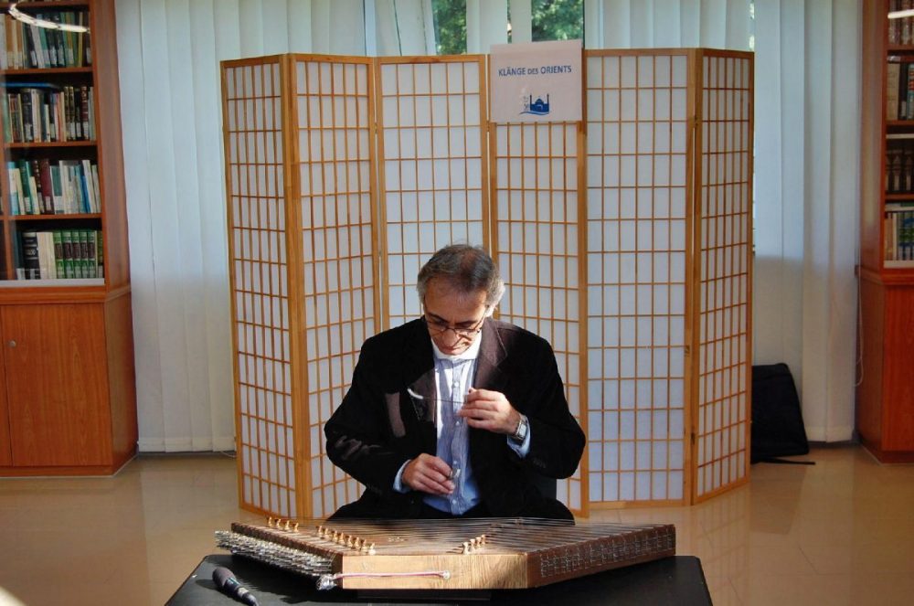 Hinter dem eigentlichen Moschee-Gebäude gibt es eine Bibliothek, in der ein kleiner Basar aufgebaut war, wo man persisches Kunsthandwerk, Tee und Pistazien erwerben konnte. Auch dieser Raum ist rund und mit einer schönen Kuppel geschmückt. Mir hat besonders die Musik gefallen, die durch einen Mann auf einer Art Zither gespielt wurde.
