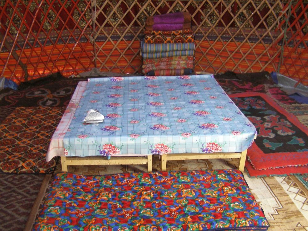 Die Jurte ist geräumig und mit bunten Teppichen ausgelegt. An den Wänden sind Decken in leuchtenden Farben für das Nachtlager ordentlich gestapelt. Draußen lachen die Kinder und ein Esel schreit. Durch die Luft zieht der Duft der Kuhdungbriketts, mit denen das Feuer vor der Jurte genährt wird. Leider ist eine Unterhaltung kaum möglich, auch der junge, ungeübte Reiseleiter erklärt nicht viel.