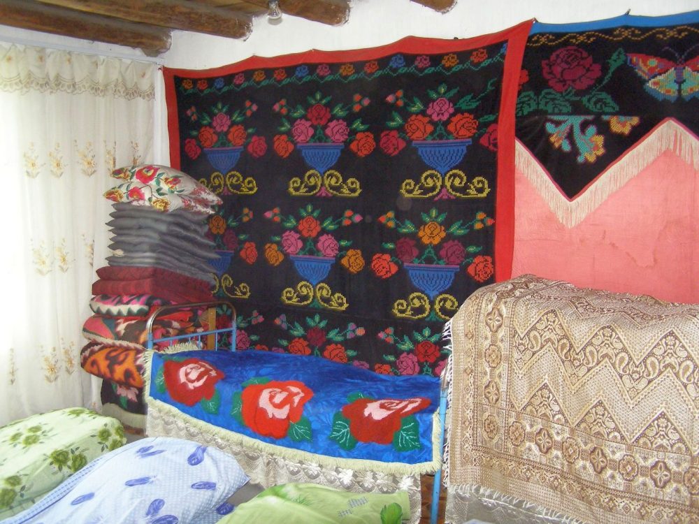 In Sary Tash gibt es kein Hotel. Wir übernachten in den Gastzimmern einer Familie. Drei Zimmer mit dicken Matratzen auf dem Boden und kuscheligen Decken stehen uns zur Verfügung. Für das Abendessen gibt es eine Jurte mit einem flachen Tisch. Auch hier kann man übernachten. Diese Gelegenheit nutzen vier von uns. Ein kleiner Waschtisch ist die Waschgelegenheit. Alles ist sehr sauber und neu.
