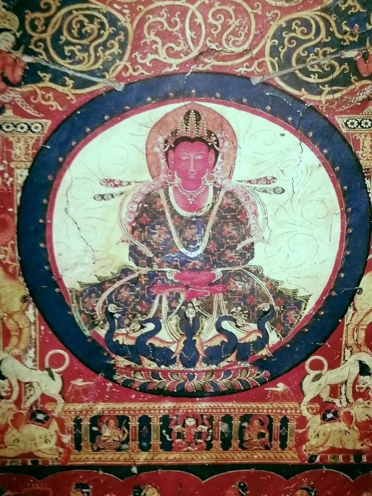 Ein Aspekt war natürlich die Verbreitung der Lehre unter der Bevölkerung, die in der Regel nicht Lesen konnte. Denen waren aber nur das Erdgeschoss zugänglich. Auch deshalb kommt den Malereien auf den Dhotis der Bodhisattvas große Bedeutung zu.