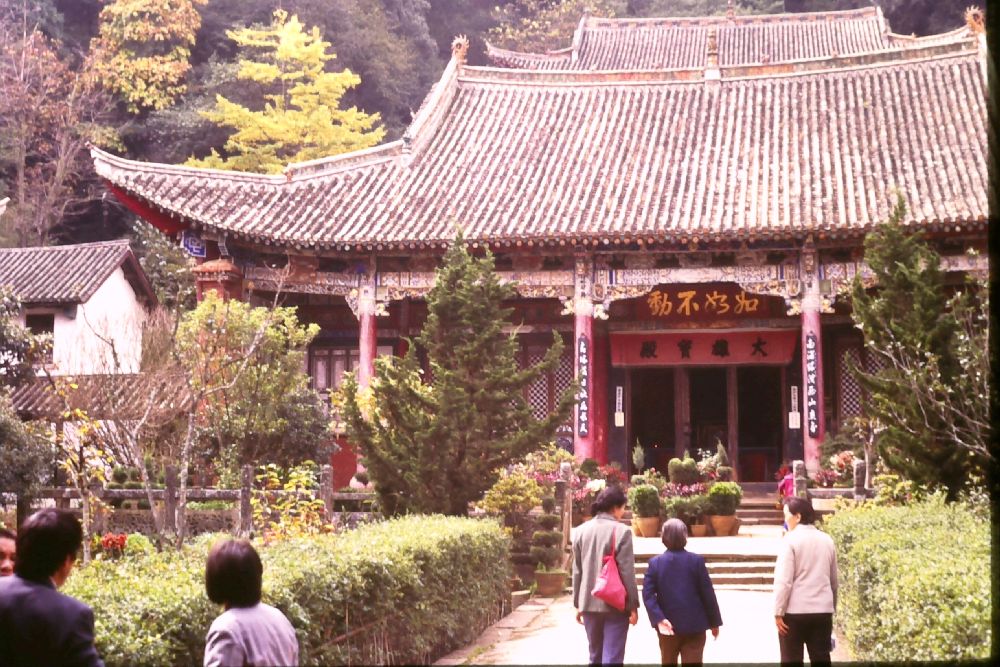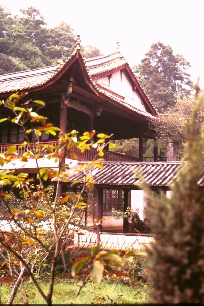 Weiter unten am Weg liegt wieder ein Tempel mit schönen Hallen, Gärten und Teichen. Die Berge mit ihren gelbgrünen Bambuswäldern und dem bunten Herbstlaub bilden den Hintergrund. Eine Gruppe ungefähr 10 Jahre alter Kinder macht sich den Spaß, mir in einem Abstand von ein paar Metern auf Schritt und Tritt zu folgen. Sie kichern und zeigen mit den Fingern auf mich. Wenn ich mich umdrehe und auf sie zugehe, laufen sie lachend und schreiend weg. Endlich ruft ihre Lehrerin zur Ordnung. Jetzt kehren Ruhe und Frieden in diesem wie verzaubert wirkenden Tempel ein.