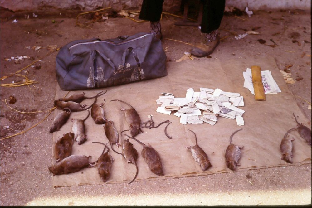 Ein Junge hat vor sich auf einem Zeitungsblatt tote Ratten ausgelegt. Sehr überzeugend wirbt er damit für die Wirksamkeit seines Rattengiftes. Wer seine Ratten lieber lebendig fängt, kann am Stand nebenan Fallen kaufen. Aus einem der Käfige blinzelt mich so ein nacktschwänziges Ungeheuer böse an.