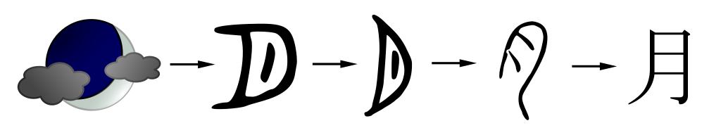 Das Zeichen 月 zeigt die Form eines Halbmonds, was darauf hindeutet, dass es eine visuelle Darstellung des Mondes ist. Im Laufe der Zeit entwickelte sich die Schrift von einer reinen Bilderschrift zu einem komplexeren System. Das Zeichen für Mond wurde über die Jahrhunderte stilisiert und vereinfacht, behielt aber seine grundlegende Bedeutung und Form bei.