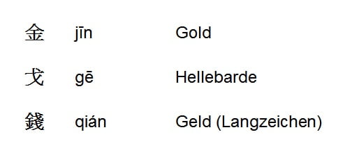 Auch das Schriftzeichen für „Geld“ verdient eine nähere Betrachtung.Das Schriftzeichen für „Geld“ bedient sich des Goldradikals, was man gut verstehen kann. Doch der 2. Teil des Schriftzeichens ist die „Hellebarde“, also eine archaische Speer- oder Axt-ähnliche Waffe. Aus dem alten, nicht reformierten Langzeichen geht hervor, dass es sich einst sogar um zwei Hellebarden handelte. Dementsprechend kann man sagen, dass Geld auf Chinesisch einst das gut bewachte Gold war.