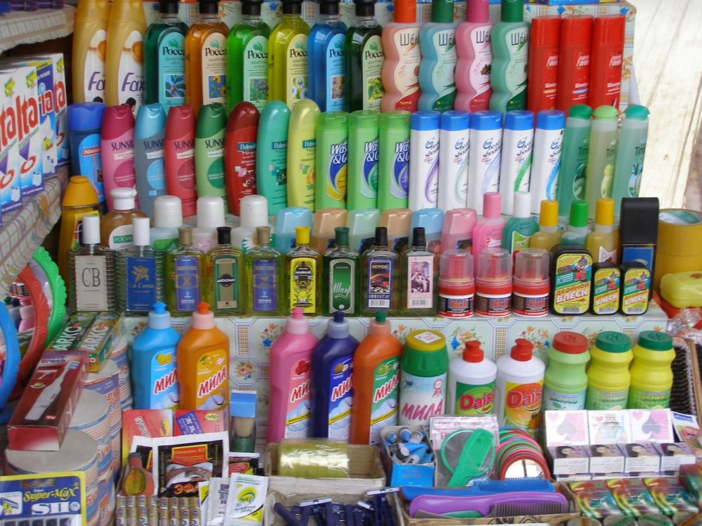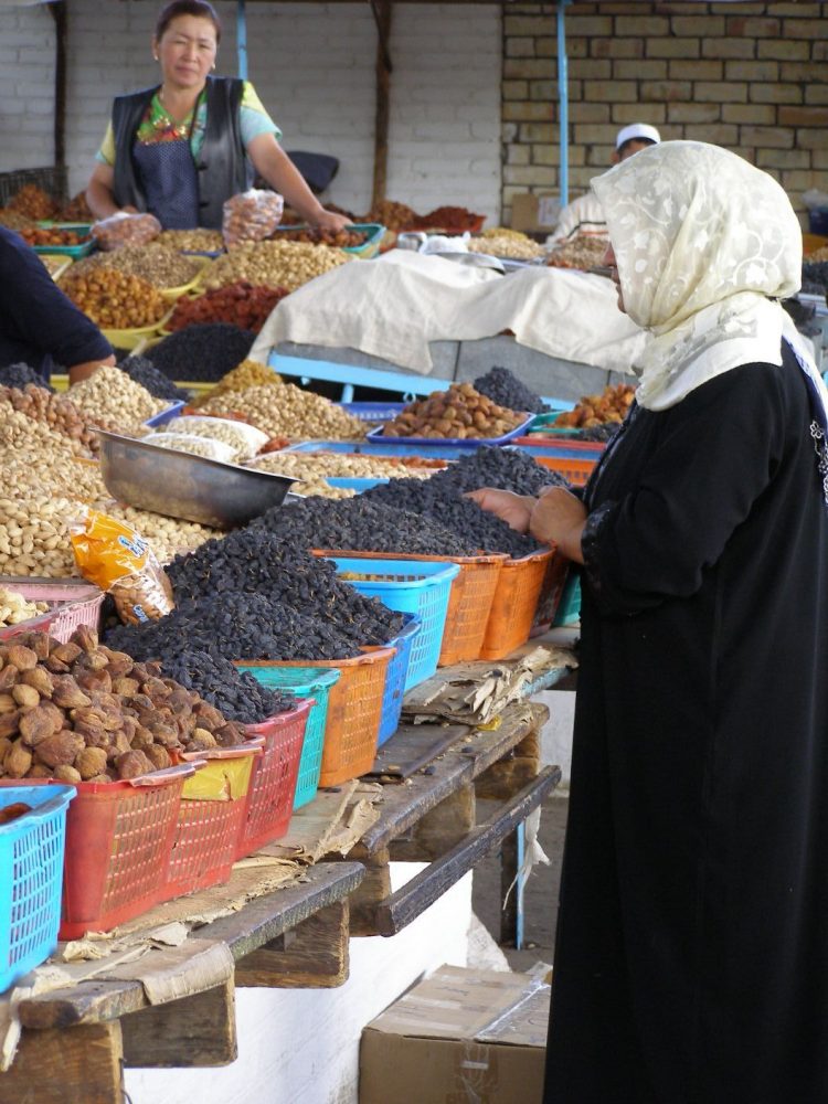 Es ist ja irgendwie schade, dass wir hier nicht wirklich einkaufen können! Staunend bewundere ich die riesigen Radieschen, die bunte Vielfalt von Handy-Hüllen. Tief atme ich die vielen exotischen Gerüche ein. Gewürze des Orients, duftende Äpfel aus dem fruchtbaren Ferghana-Tal. Russische Waschmittel, internationale Shampoo-Marken, man findet alles für den täglichen Gebrauch. Das Flair der Seidenstraße schwebt über und in allem.