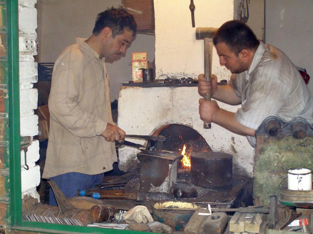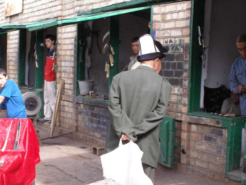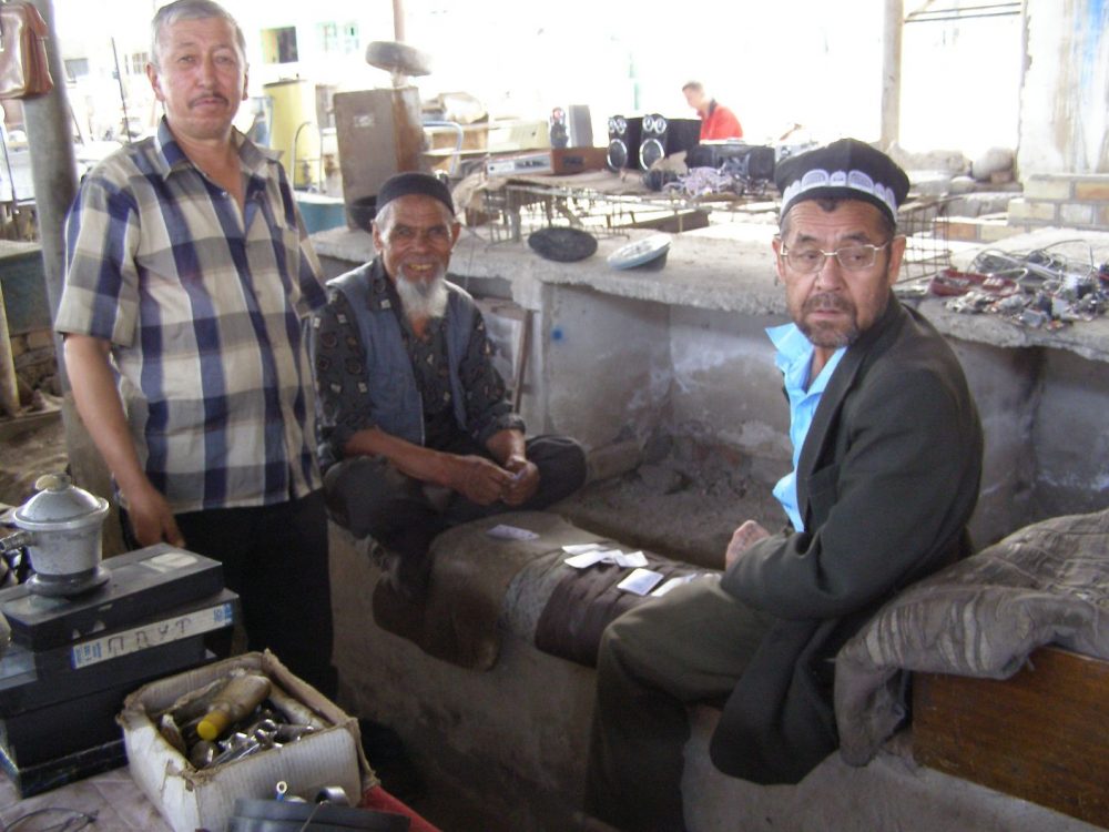 Dann erreichen wir eine weitere spannende Abteilung des schier endlosen Bazars: Die Haushaltsgeräte und Metallwaren. Wir bekommen einen interessanten Einblick, wie ein kirgisischen WC aussehen kann. Oder die Waschstände, wie wir einen in Sarytash erlebt haben. Sehr interessant! In kleinen Werkstätten wird fleißig gehämmert und geschmiedet. Das ist die Domain der Männer, die mit Kennerblick von Stand zu Stand gehen.