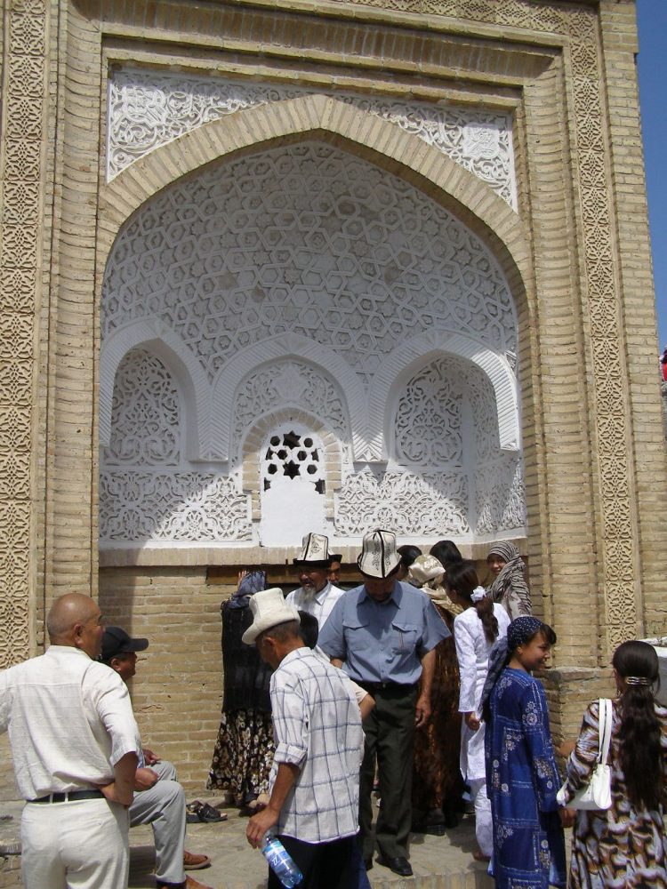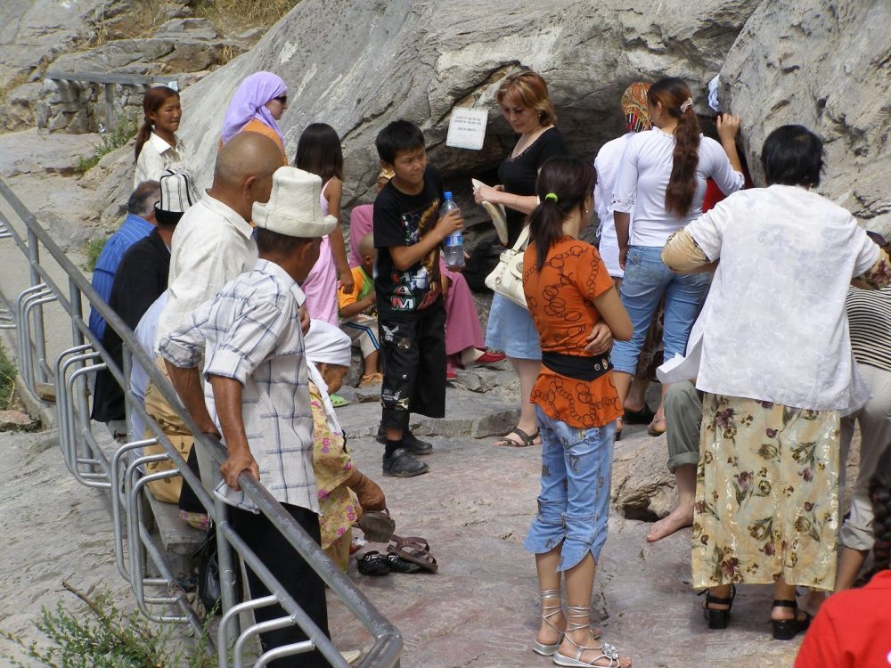 Auf dem Gipfel reihen wir uns in die Schlange von Pilgern ein, die in das kleine „Haus von Babur“ hinein wollen. Ich bleibe lieber draußen und teile mit kirgisischen Frauen und Männern den spärlichen Schatten eines alten Baumes. Ein Schluck Wasser, ein Stück Fladenbrot, lecker! Die freundlichen Frauen bieten uns Tee an. Wir verständigen uns mit Lächeln und Gesten.
