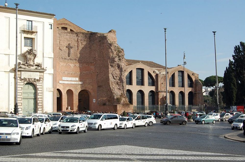 Die Kirche Santa Maria degli Angeli wurde in den Resten des Frigidariums (Abkühlraum) der Diocletiansthermen errichtet. Das Vestibül liegt im ehemaligen Tepidarium (Wärmeraum). Der imposante Eingang ist eine Exedra des Caldariums (Warmbaderaum).