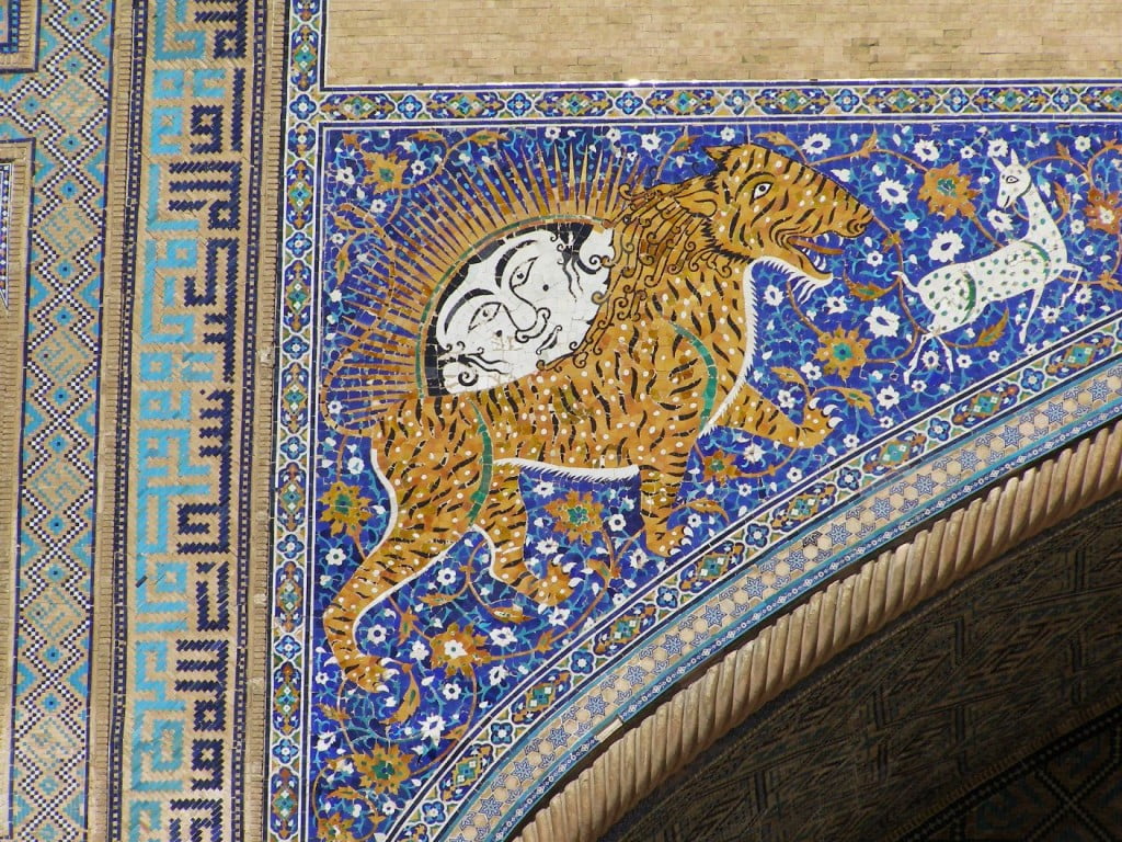 Der Ulugh Beg Medresse gegenüber liegt die Sher Dor Medresse. Wie die Tilja Kari-Medresse stammt sie aus dem 17. Jahrhundert. Sie weist eine große Besonderheit auf: Der mächtige Eingang (Pishtaq) wird rechts und links von einem Tiger geschmückt, der einer Gazelle nachstellt. Über dem Rücken ist die Sonne zu sehen, die menschliche Gesichtszüge trägt. Das ist ungewöhnlich, da das islamische Bilderverbot solche Darstellungen nicht zulässt. Aber man kennt auch Ausnahmen. Von diesen Darstellungen hat die Medresse ihren Namen: „Haus des Tigers“.