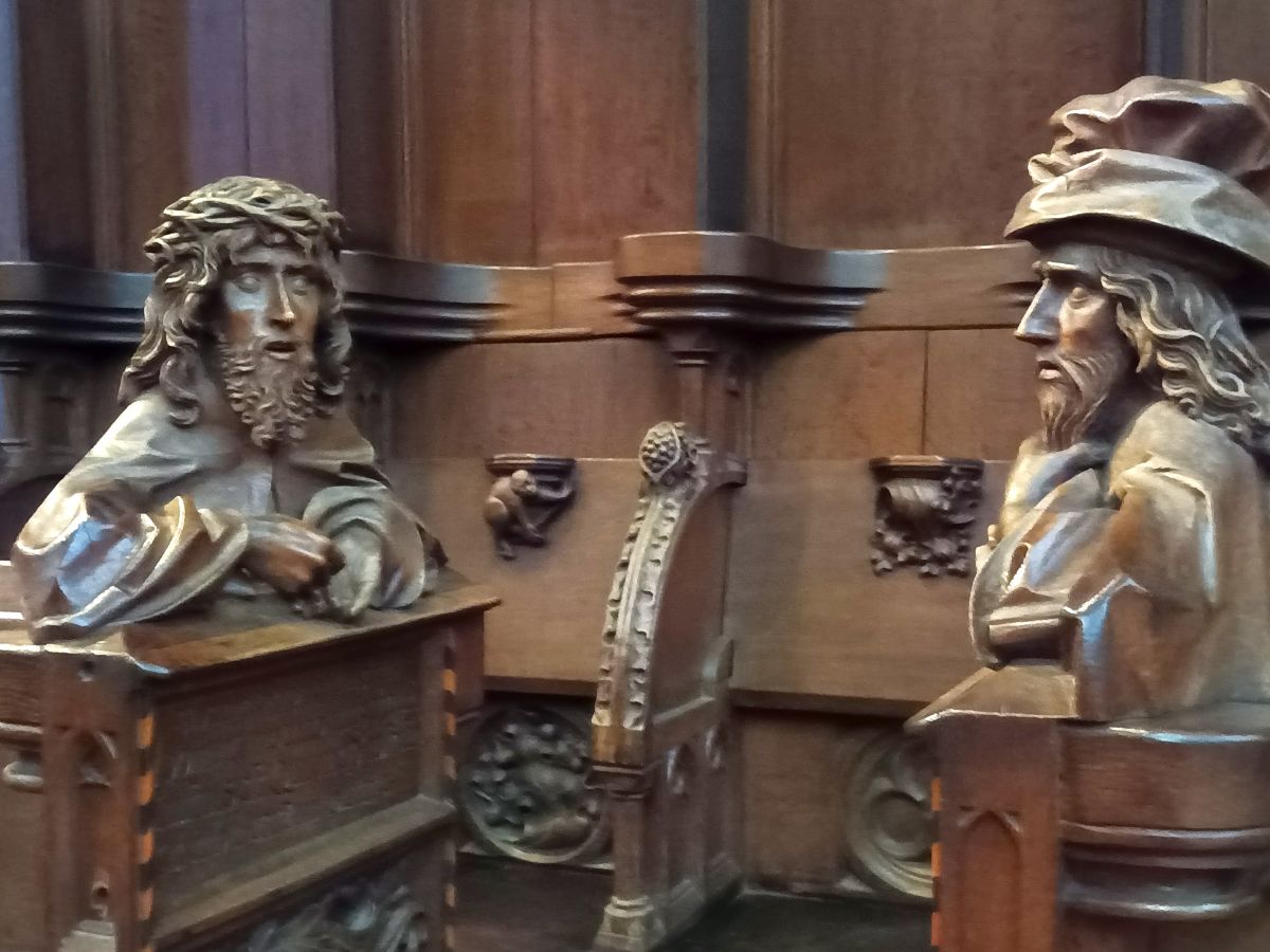 Zwei Tatsachen finde ich dabei besonders bemerkenswert: Zum Einen die Unterteilung in zwei gleich große Gestühle, das eine den Männern gewidmet, das andere den Frauen. Dabei ist aber zu bedenken, dass die Chorherren. die das Privileg hatten, dort zu sitzen, eben Herren waren, auch auf der Frauenseite.