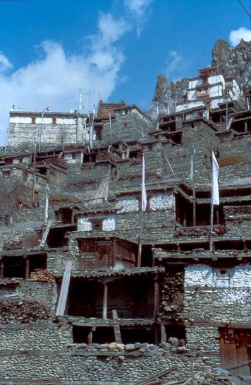 Nachdenklich gehe ich weiter. Ein großer Chörten, eine Stupa, bildet den Eingang zum Dorf. Braga macht einen mittelalterlichen Eindruck. Zu dem alten Tempel ganz oben führen Pfade, die teilweise über die Dächer der Häuser gehen. Die aus grauen Steinplatten gebauten Häuser sind alle eins aufs andere gebaut. An dünnen Masten wehen weiße Gebetsfahnen im kalten Wind. Manchmal führen schmale Holzstiege weiter. Ich frage mich, wo ich mich auf einem öffentlichen Weg und wo ich mich in einem Hof bzw. Haus befinde. Ich begegne nur wenigen Menschen.