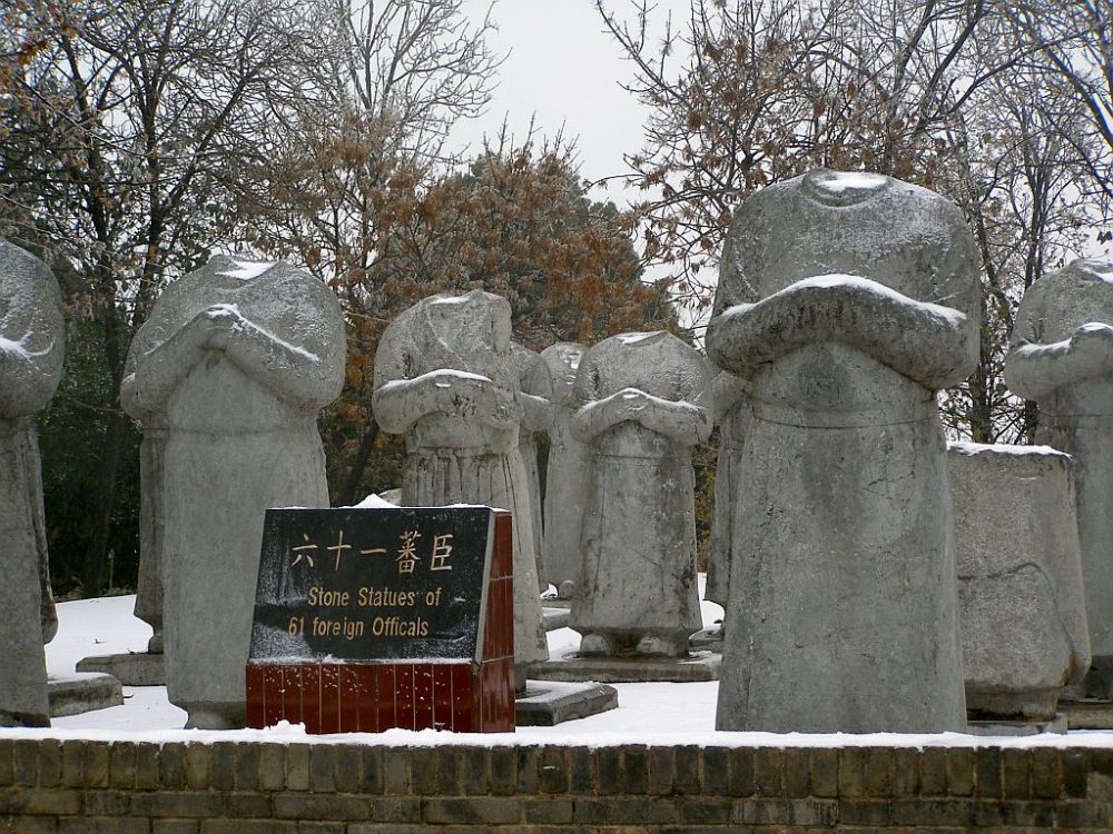 Auffallend ist die Gruppe von 61 lebensgroßen Statuen ohne Kopf am Ende des Weges. Sie repräsentieren die ausländischen Gesandten, die beim Begräbnis von Wu Zetian zugegen waren. Der Name jedes Einzelnen und das Land, aus dem er kam, ist in den Rücken der Statuen eingraviert. Es ist nicht bekannt, warum die Figuren alle ohne Kopf dastehen. Manche sagen, dass dies schon auf Veranlassung der Kaiserin geschah, die damit ihre Macht demonstrieren wollte. Das ist aber sehr unwahrscheinlich.